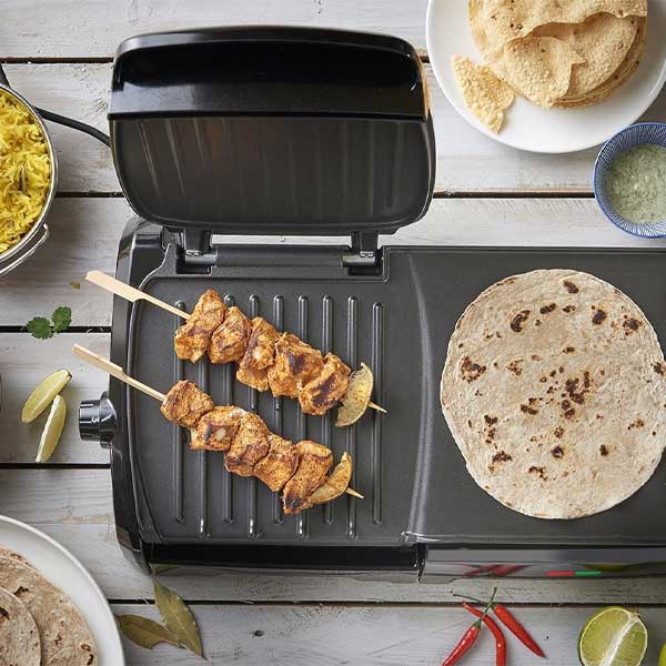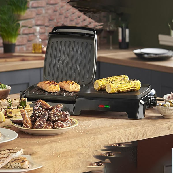 - Ideal-fit drip tray slots in place. Please note that the grill cannot be used in open position.